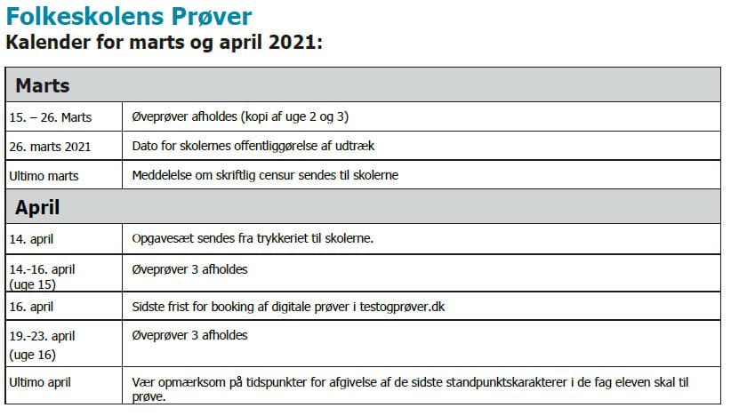 Som følge af aflysningerne af flere af prøverne i prøveterminenmaj/juni 2021 vil der blive stillet en ny øveprøvetermin tilrådighed. Denne øveprøvetermin (øveprøver 3) vil bliveafviklet den 14.-16. april (uge 15) og 19.-23. april (uge 16).