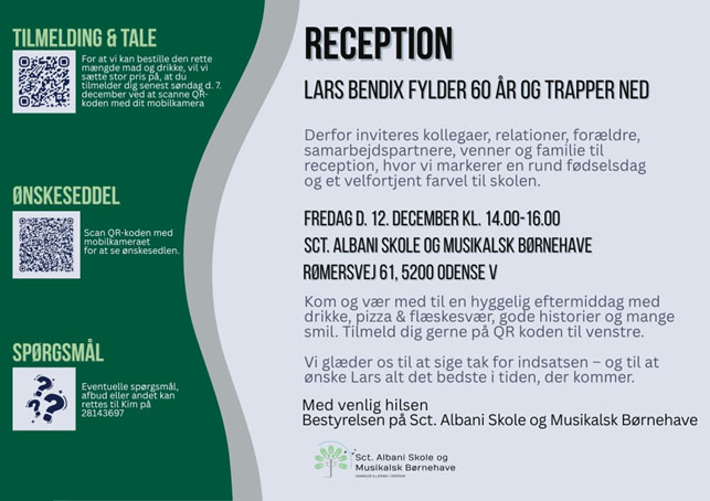 I anledning af Lars Bendix’ 60-års fødselsdag og kommende pension inviterer bestyrelsen ved Sct. Albani Skole og Musikalsk Børnehave til reception den 12. december 2025 kl. 14.00–16.00.
